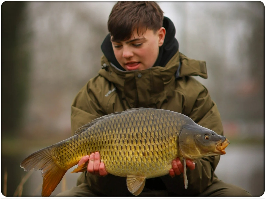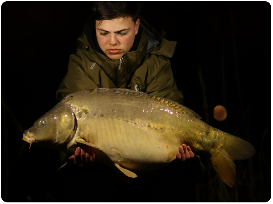 Het is inmiddels al pik donker en rond de klok van half tien gaat Klaas zijn linker hengel af. Bob had al verteld tegen Klaas als die hengel af gaat is het altijd een grote met een lach op zijn gezicht. Maar blijkbaar had Bob dus echt gelijk de vis deed bijna niet kopschudden en zwom heel rustig. De spanning steeg en wilden deze vis echt niet verspillen. De karper kwam dichter bij de kant en we zagen dat het een mooie vis was. Snel het net eronder en... Binnen!