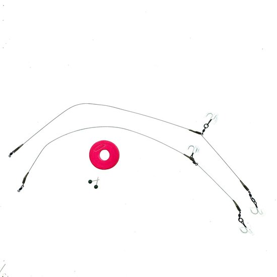 Twee takels voorzien van twee dreggen. Deze takels bezitten twee VMC 9650 dreggen in maat 6 of 2. Deze dreggen zijn bevestigd aan een spliting die weer aan een wartel vast is gemaakt. Deze wartel is op de Ultra Thin Wire bevestigd. Op deze manier draait de dreg 360graden ten opzichte van het staaldraad. Hierdoor zal de lijn minder snel kinken. Beide dreggen zitten vast bevestigd aan het staaldraad, ze schuiven dus niet! Hierdoor zal de aasvis zich niet “krommen” wanneer men de aasvis binnen draait, of wanneer men uitwerpt. De takels zijn met sleeves gelust en over deze sleeve zitten mooie, zachte bescherm rubbers die de montage goed afwerken. Glad en sterk! De 30lb, 19 strands Ultra Thin Wire is zeer soepel en sterk. De takels hebben een lengte van 50cm.